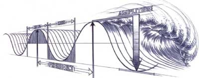 DEVELOPPEMENT (PARTIE 1)1) Qu'est-ce que la houle ? a) Définition : La houle est un mouvement ondulatoire de la surface de la mer, c’est une suite infinie d’ondulations parallèles presque identiques, qui se propagent de façon sensiblement uniforme vers le rivage. C’est un type de vagues forcées par le vent, qui se propage en dehors de sa zone de génération (ceci sera expliqué dans la partie « formation de la houle »). D’un point de vue plus physique, la houle correspond à une onde progressive mécanique périodique sinusoïdale. Les ondes progressives mécaniques périodiques sont le phénomène qui accompagne la propagation, dans un milieu matériel supposé linéaire et illimité, d'une perturbation se répétant indéfiniment. Elles correspondent à des déformations périodiques d'une interface. Elles sont dites sinusoïdales si la perturbation créée par la source, est une fonction sinusoïdale du temps, de période T. La houle se propage donc de façon périodique à la surface de contact entre l'eau et l'air, par vibration de matière. Il s'agit d’un déplacement d'énergie et non de matière. D'autre part, la houle est une onde longitudinale. En effet, il s’agit d’une perturbation se propageant dans un milieu, sans transport de matière, et de plus, la déformation du milieu, et la direction de propagation de l'onde ont la même direction. En océanographie, les ondes de surface se matérialisent par une déformation de la surface de la mer, c'est-à-dire une déformation de l'interface entre l'atmosphère et l'océan. Par ailleurs, la houle est ce que l'on appelle une onde courte (nous expliquerons pourquoi et quelles en sont les conséquences dans la suite notre TPE). Bien qu'en réalité, la houle ne soit pas un phénomène périodique qui s'interprète en fait comme une somme d'une infinité de composantes sinusoïdales infiniment petites, nous considèrerons sa représentation comme une simple et parfaite sinusoïde, dans le but de pouvoir l’étudier et vous expliquer son mécanisme sous un aspect physico-mathématiques.