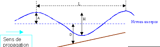 b) Caractéristiques physiques : Une onde, et donc la houle se caractérise par : Sa période notée T : c’est l'intervalle de temps (en secondes) qui s'écoule entre le passage de deux crêtes successives au niveau d'un point fixe. Sa fréquence notée f : c'est le nombre de trains de houle (en Hertz) passant en un point fixe en une seconde, elle est égale à 1 / T. Sa longueur d'onde notée λ ou L : c'est la distance (en mètres) entre deux crêtes ou de creux de deux vagues successives. Sa hauteur notée H : c'est la dénivellation verticale (en mètres) entre la crête et le creux de la vague. Son amplitude notée A : c’est la dénivellation verticale (en mètres) entre la crête de la vague et le niveau de la mer au repos, soit une demie hauteur. Sa célérité ou vitesse de propagation notée c : c'est la distance parcourue par une crête ou un creux en même temps donné (en mètres par secondes), elle est égale à λ / T, (nous développerons plus en détails cette formule dans la partie « propagation de la houle »). Sa cambrure notée C : c’est le rapport entre la hauteur et la longueur d'onde, elle est égale à H/ λ, (nous utiliserons cette formule dans la partie « déferlement de la houle »). Son Fetch : c'est la distance sur laquelle le vent souffle pour engendrer la houle, (nous expliquerons plus précisément son importance dans la partie consacrée à la « formation de la houle »). Sa profondeur notée D : c’est la distance (en mètre) entre la ligne de repos et le fond de l’océan (elle aura son importance dans la partie concernant le « déferlement de la houle »). Voici un schéma pour y voir plus clair…