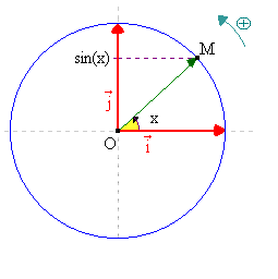 Pour tout point M d'un cercle, on peut associer une ordonnée appelée y = sin(x) où x correspond à l'angle MÔI exprimé en radians. La fonction sinus est donc définie sur R. f (x) = sin(x) définie sur R. 2) Parité et périodicité :