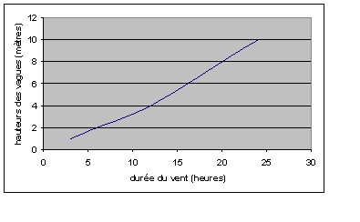 m m L'influence de la durée du vent sur la taille des vagues a été déterminer par l’océanologue Norvégien Sverdrup, qui a établi qu’un vent de force 7 (=30nœuds) soufflant en haute mer formait des vagues dans le rapport ci dessous :