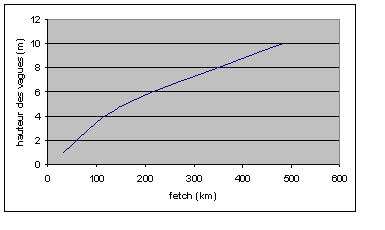 Grâce à ce dernier, on se rend compte que plus le vent souffle longtemps, plus les vagues seront grosses. L'influence du fetch est démontrée par le tableau suivant, dans lequel, toujours pour un vent de force 7, sont mis en rapport la distance du fetch et la hauteur des vagues formées :