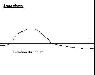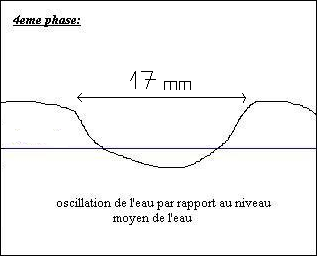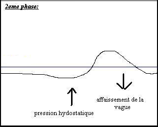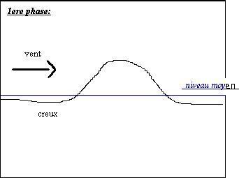 DEVELOPPEMENT (PARTIE 2)2) La formation : a) La naissance : Contrairement à ce que l’on pourrait penser, la marée n'est pas à l'origine de la houle. La principale cause de sa formation est le vent par déplacement des particules d'air des hautes pressions vers les basses pressions. Lorsque le vent se met à souffler sur une étendue d’eau calme, il se forme des rides à la surface de la mer. Elles sont provoquées par des turbulences (variations locales de pression), qui accompagnent les déplacements d'air. Lorsque ces rides sont formées, elles donnent une prise au vent, et quand celui-ci a au moins atteint une vitesse de quatre noeuds (=7,408 km/heure), il renforce ces oscillations et les fait grandir. Le vent est rarement régulier et va engendrer des vagues de différentes tailles, les plus petites se briseront et alimenteront les plus grosses en énergie pour les renforcer. L’air en mouvement au dessus de la mer adhère aux particules d’eau de la surface (qui sont fortement liées à celles de l'intérieur de la vague), donc lorsque le vent pousse l'eau devant lui, il entraîne les molécules d'eau de la surface, qui entraînent elles mêmes les molécules d'eau de la vague. Cela entraîne donc une légère élévation du niveau de l'eau vers l'avant, alors qu'un creux se forme a l'arrière (1ère phase). La pression hydrostatique (ou poussée d’Archimède) et l'affaissement de la vague se compensent petit à petit (2ème phase). La pression hydrostatique tend donc à combler le creux (3ème phase) pendant que le poids de la vague permet un affaissement du front. Tout ceci amène à un balancement de la vague du front vers le creux (de l’avant vers l’arrière) et donc à une oscillation autour du niveau moyen de la mer (4ème phase).