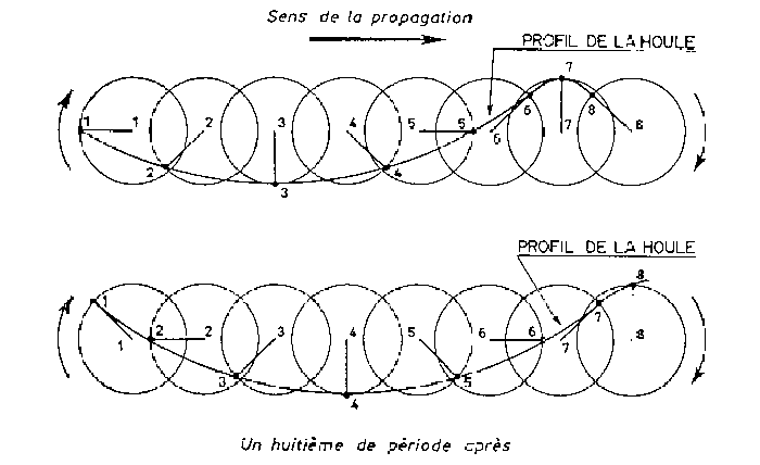 m Ce tableau nous permet de bien nous rendre compte que plus la période et la longueur d'onde sont importantes, plus la houle va vite. 1 c) Le mouvement des particules d’eau : 1 Comme nous l’avons dit précédemment, le voyage de la houle se fait par transport d’énergie et non de matière. Au passage de l’onde, les particules d’eau sont misent en mouvement mais restent pratiquement à la même position. Pour allez plus loin dans ces explications, nous allons développer la théorie d’Airy, un célèbre physicien anglais du 19ème siècle. Ce dernier à démontrer que le mouvement des particules d’eau est une oscillation périodique, dont la vitesse varie en fonction de la profondeur de l’océan. Sous l’effet de cette propagation, la crête de la vague va s’avancer, et le mouvement des molécules d’eau va se faire sous forme d’orbites circulaires. Ceci va engendrer un faible mouvement d’avancée, un peu plus fort que le mouvement de retrait, afin que les particules ne se retrouvent pas exactement, mais quasiment à leur position initiale. Ainsi, dans leur mouvement, les vagues font tourner sur place les particules voisines de la surface, qui forment alors des orbites circulaires dont le diamètre est égal à la hauteur de la vague. Vous trouverez ci-dessous un schémas nous montrant ce phénomène, chaque orbite circulaire étant numérotée, vous pourrez observer le déplacement par rotation, des particules d’eau qui la composent, avec un écart de un huitième de période entre les 2 « prises » :
