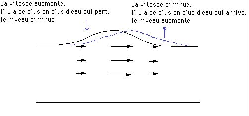 Grâce à ce phénomène, à un instant t (représenté ci-dessous), la vague s’amincit là où la vitesse des particules d’eau augmente, et la vague est étirée. En revanche, là ou la vitesse diminue, il y a augmentation du niveau, car par conservation du débit, le ralentissement des particules d’eau va « soulever » la surface de l’eau et l’on va observer l’apparition d’une bosse qui va se déplacer (ici vers la droite) :
