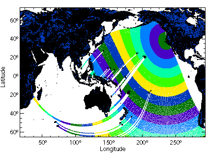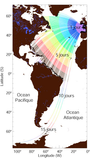 A noter également qu’il n’est pas rare que plusieurs trains de houle générés dans des zones différentes, se combinent. Ce phénomène sera d’autant plus fréquent que la houle vient de loin. Elle peut aussi se superposer à une mer locale, plus courte et généralement de direction différente, on parle alors de mers croisées. b) La célérité (ou vitesse de propagation) : La célérité correspond à la vitesse de propagation une crête ou d’un creux d'une vague. La célérité de la vague croit avec son amplitude et elle est différente selon le type d'onde. Cette formule correspond à un rapport faisant intervenir au numérateur, la longueur d’onde λ et au dénominateur, la période T de la houle. On peut donc en déduire que l’onde ayant la longueur d'onde la plus grande se propagera le plus rapidement. C'est d'ailleurs grâce à cela que la houle s'organise pour devenir plus propre, c'est ce que l'on appelle la dispersion radiale. En effet, les longueurs d'onde les plus longues, donc les plus rapides, distancent les longueurs d'onde les plus courtes qui sont plus lentes. Par ailleurs, voici un tableau montrant la relation qu’il existe entre l'éloignement d'une perturbation, la hauteur de la houle, sa période et le temps qu'il lui faut pour arriver et déferler sur nos plages :