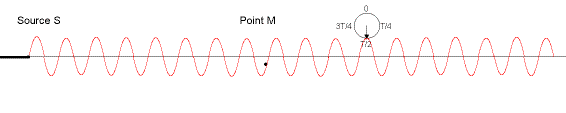 A noter qu’une formule existe pour calculer le diamètre des cercles décrivant les trajectoires des particules d’eau, celle-ci, qui met en relation l’amplitude, la longueur d’onde et la profondeur, est bien trop compliquée pour que nous la démontrions. Il est néanmoins très important de préciser qu’habituellement, un point atteint par une onde, reproduit l’état de la source avec une amplitude moindre et un retard dû à la durée nécessaire à l’onde, pour parcourir la distance qui sépare la source de ce point. C’est ce qui nous est montré par cette animation, où le point M effectue le même mouvement que la source, c'est à dire un mouvement vertical :